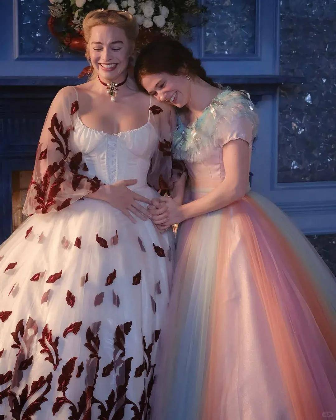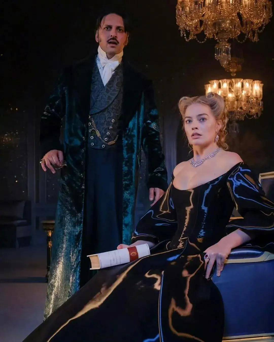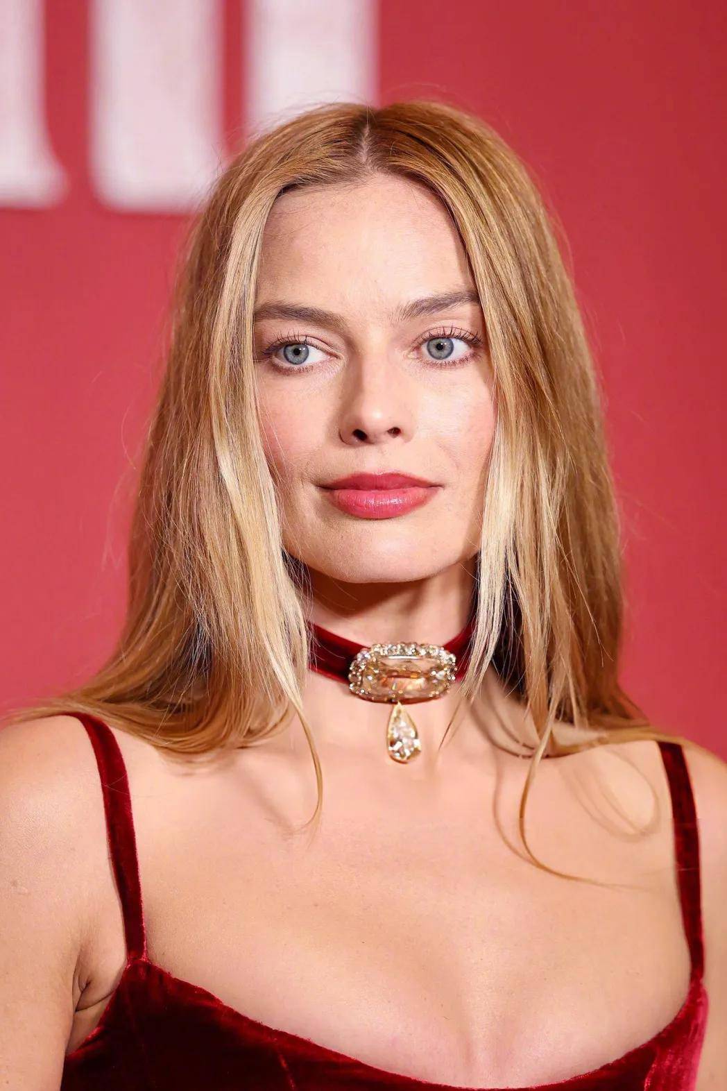 这身造型的另一个话题点是,Margot脖子上佩戴的那条伊丽莎白·泰勒珍藏的卡地亚泰姬陵钻石传奇颈链,价值约5000万人民币,这条项链是理查德·伯顿送给泰勒的40岁生日礼物,象征永恒之爱,与影片虐恋主题呼应。