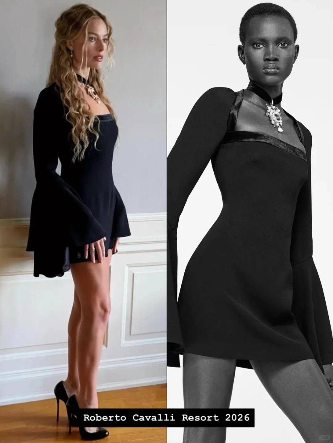 洛杉矶站,她还穿了这条来自Roberto Cavalli2026度假系列黑色短款连衣裙,搭配的红宝石黑丝绒choker,与裙子的黑丝绒方领形成呼应。这身造型的最大话题点依然是她脚上那双刑具般的高跟鞋,仿佛原地跳芭蕾。