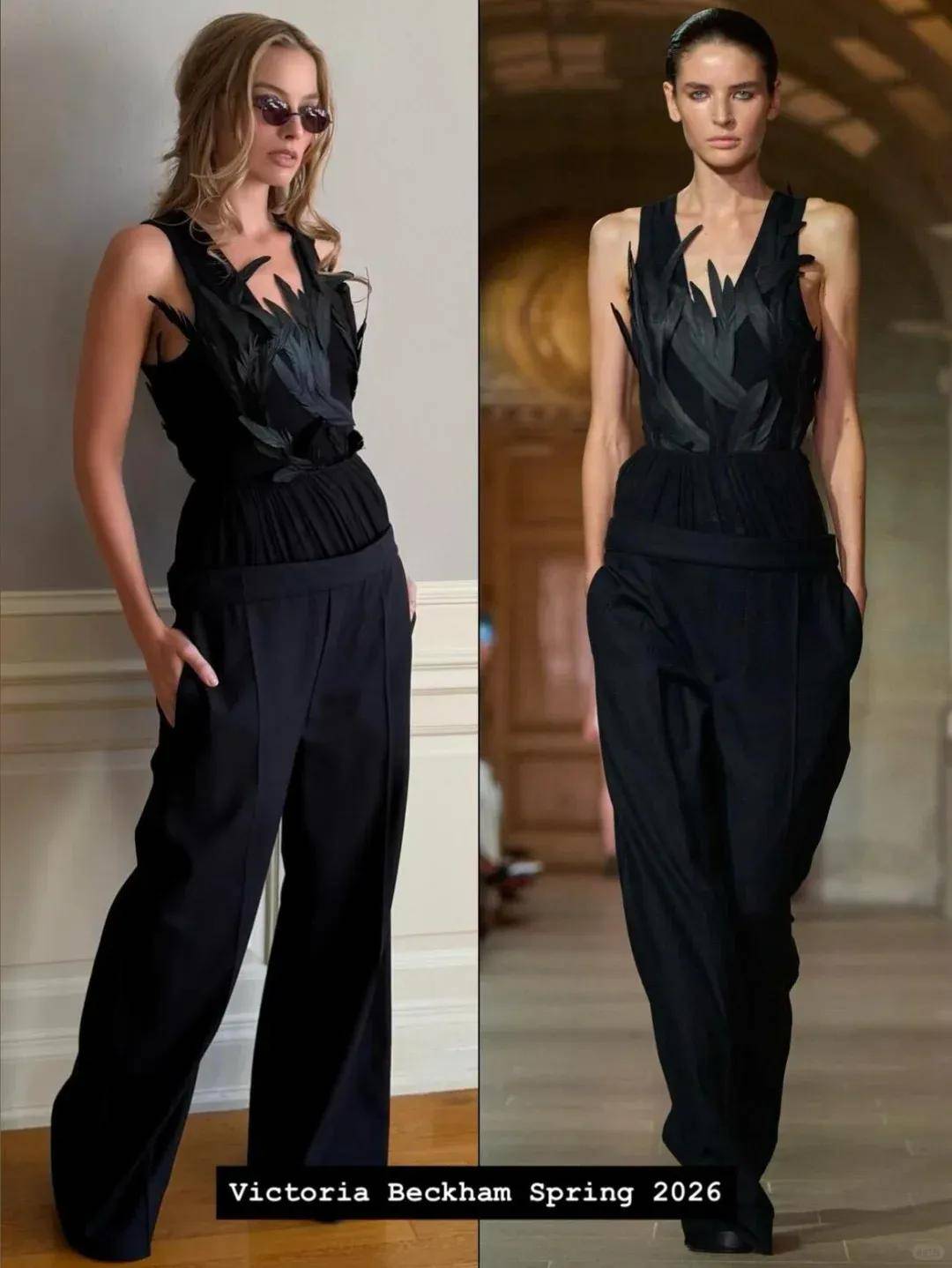 黑白两身羽毛服饰均来自Victoria Beckham,造型灵感源于《呼啸山庄》原文中那段话:“她在床上辗转反侧,发烧引起的精神错乱近乎疯狂,用牙齿撕扯着枕头……凯茜似乎像个孩子一样,把枕头上的羽毛从她刚刚撕开的口子里拽出来,然后按照不同的种类把它们排列在床单上。”